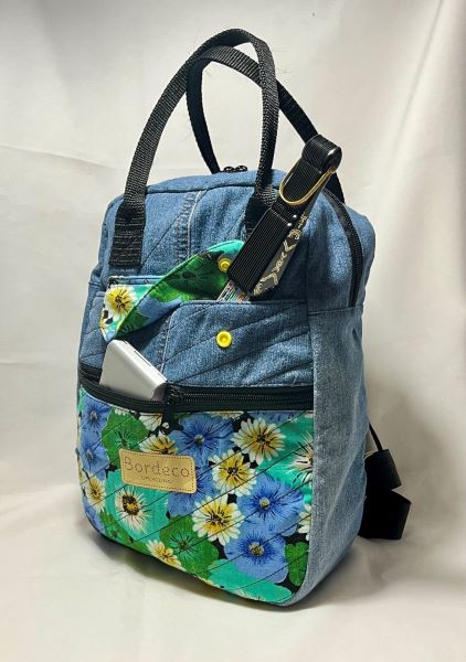 Mochila Estrellita frontal medio lado, denim y tela con flores BordecoMochila de jeans reciclado Estrellita y telas reutilizadas – Bordeco